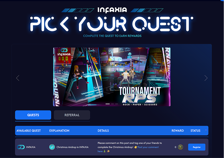 Login to your INFAXIA account and go to your Quest Page. Look for the “Christmas Airdrop on INFAXIA” quest and click REGISTER on the Status column.